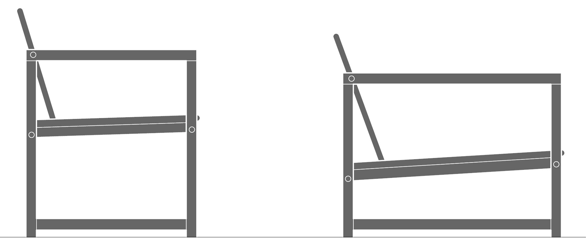 The first design iteration established the core mechanics: in the transformation from a chaise-lounge to an armchair, the headrest would become the back "legs" and the legrest would become the front "legs".