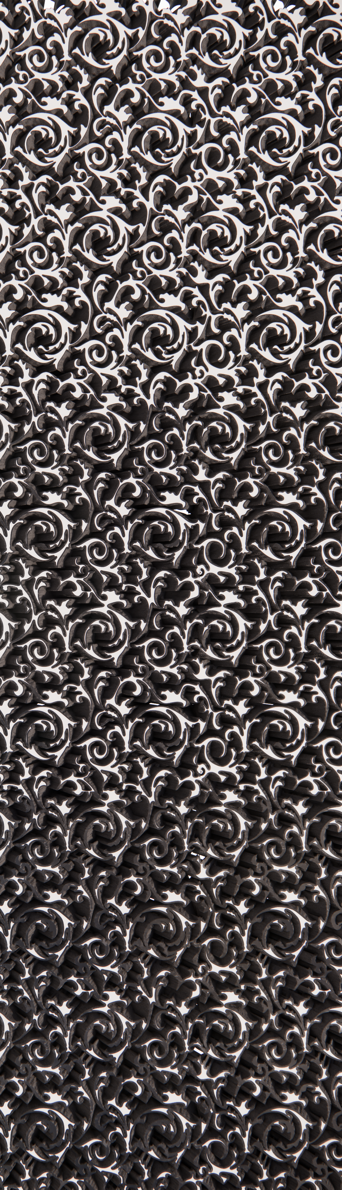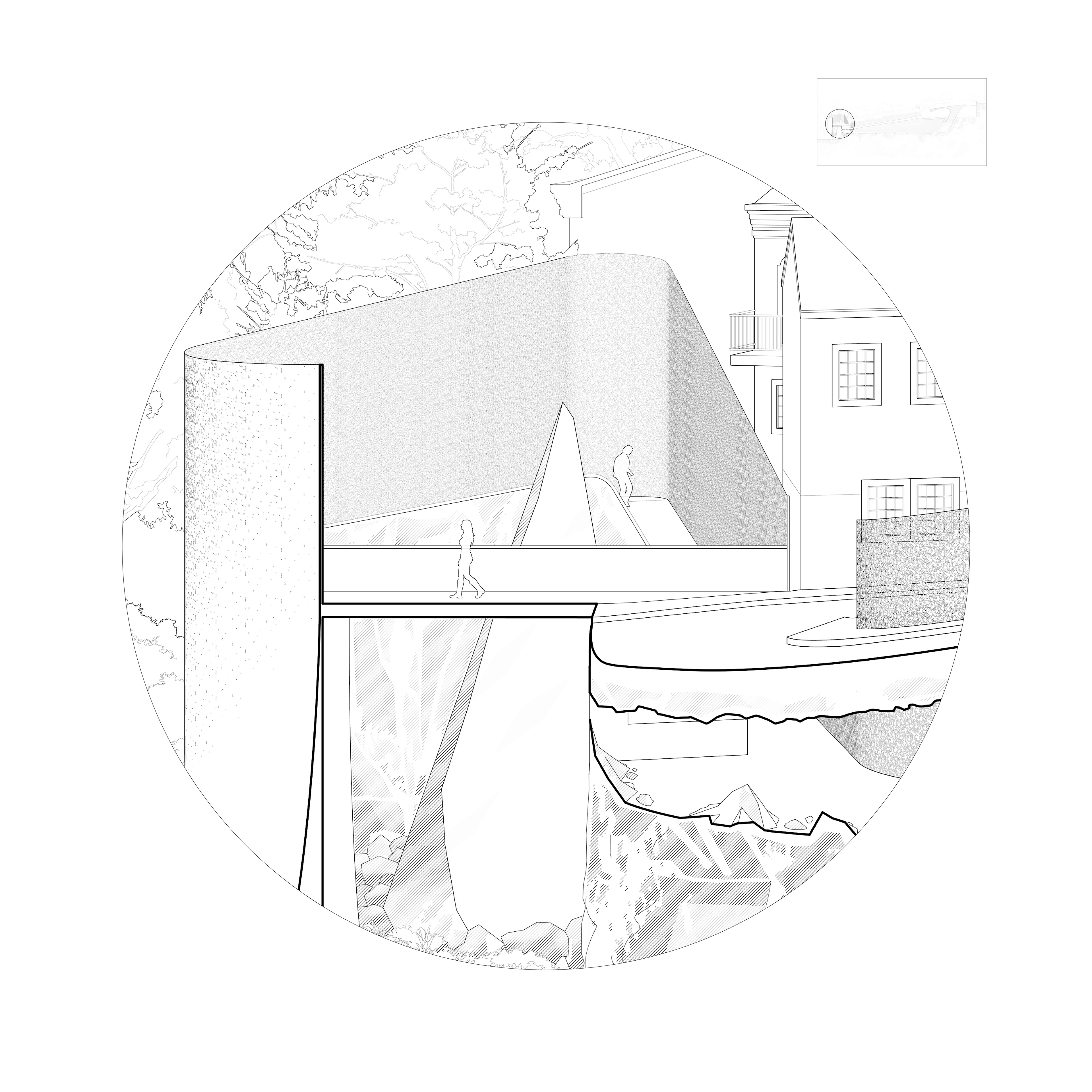 As you enter the open courtyard, the scrim begins to dissolve, leaving a Baroque pattern. The faces white, and the cut sections glazed in blue, a contemporary take on the Portuguese tile, or Azulejo. As the ceramic scrim begins to turn the corner, the blue transitions to black until the scrim reaches the rock wall forming the base of the adjacent dwelling.