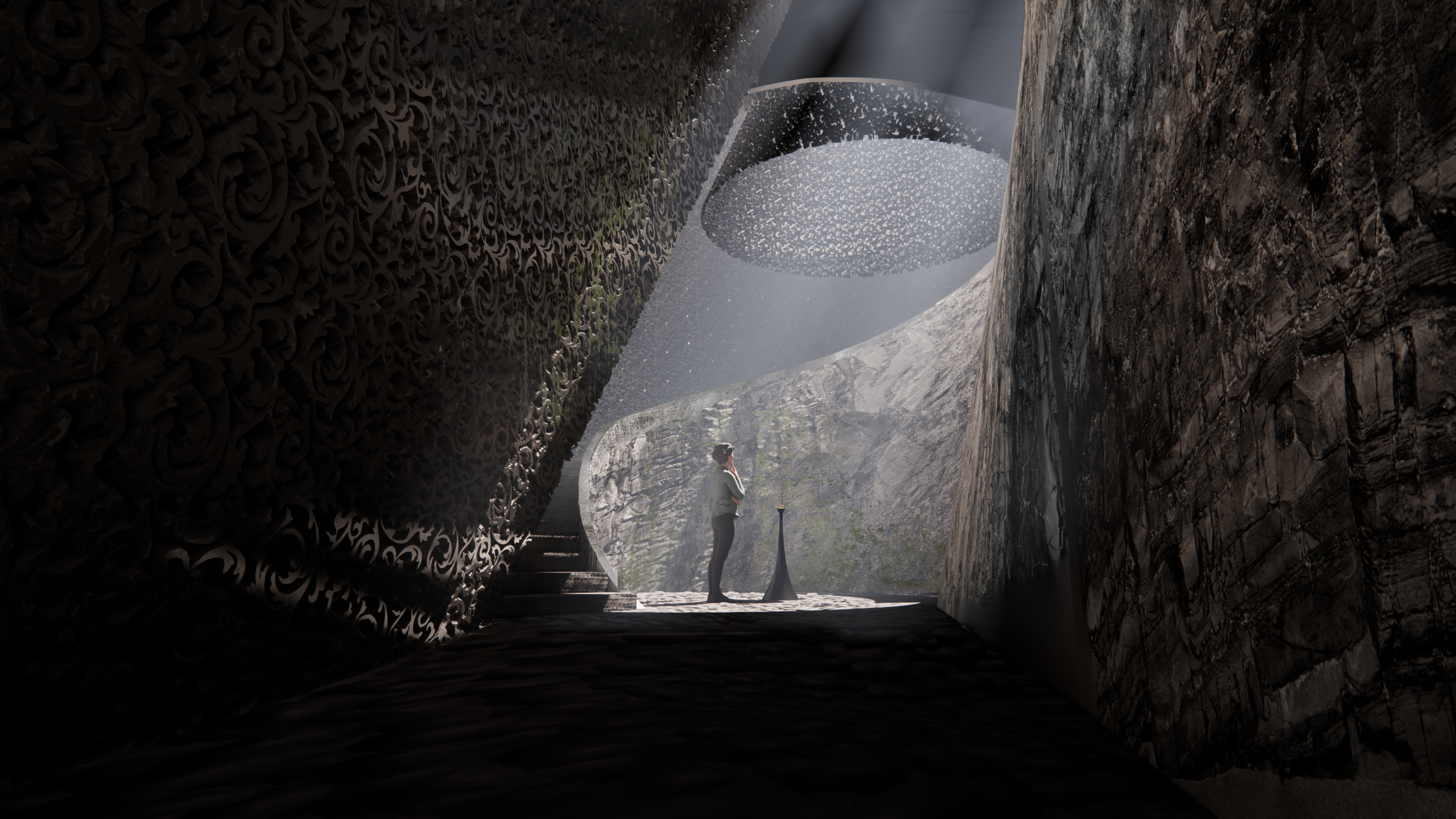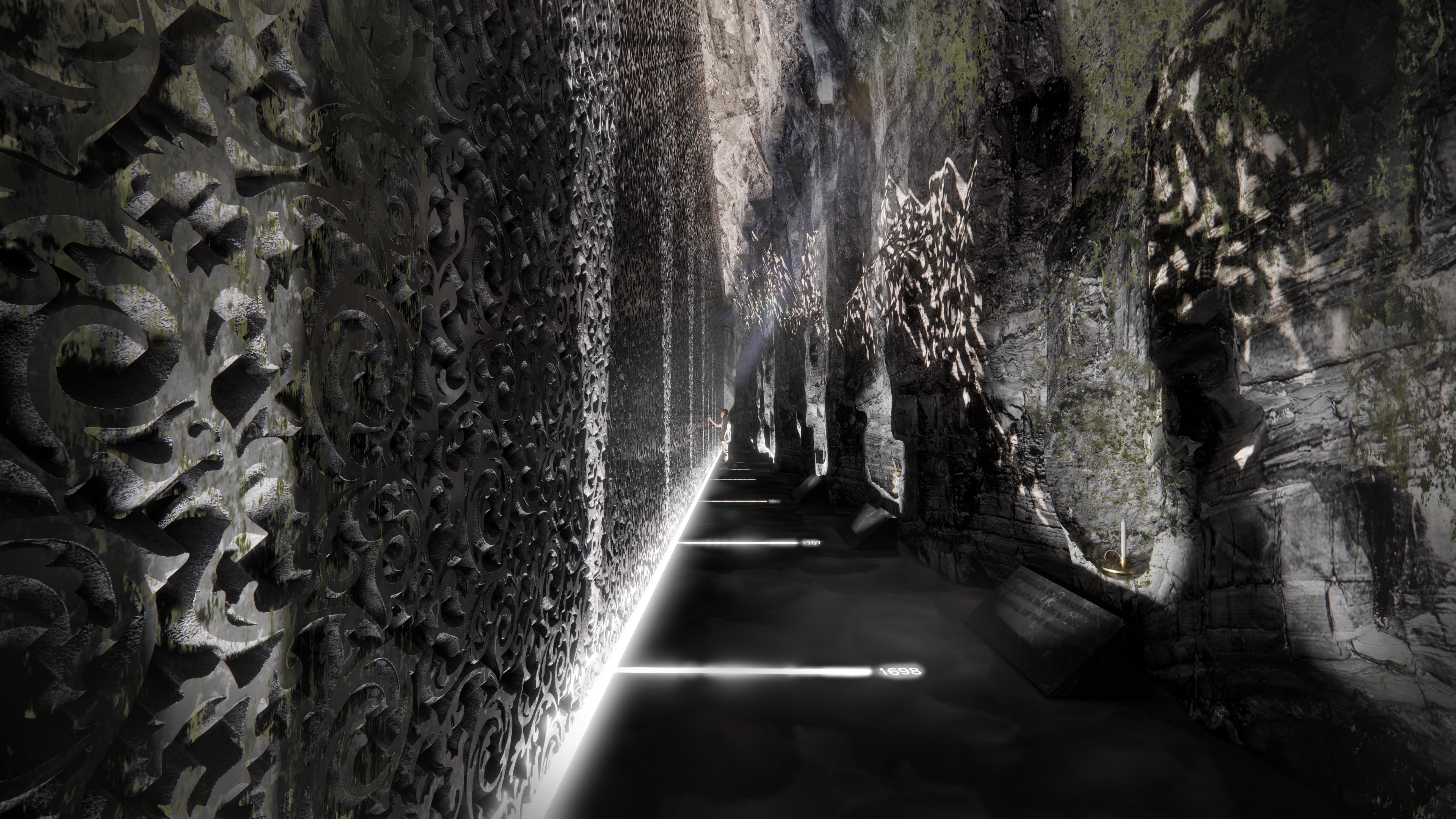 Once inside, the path is illuminated with a dim glowing linear light lining the now ceramic-inlayed, stone-carved façade on the left, with an excavated rough-cut stone wall on the right.