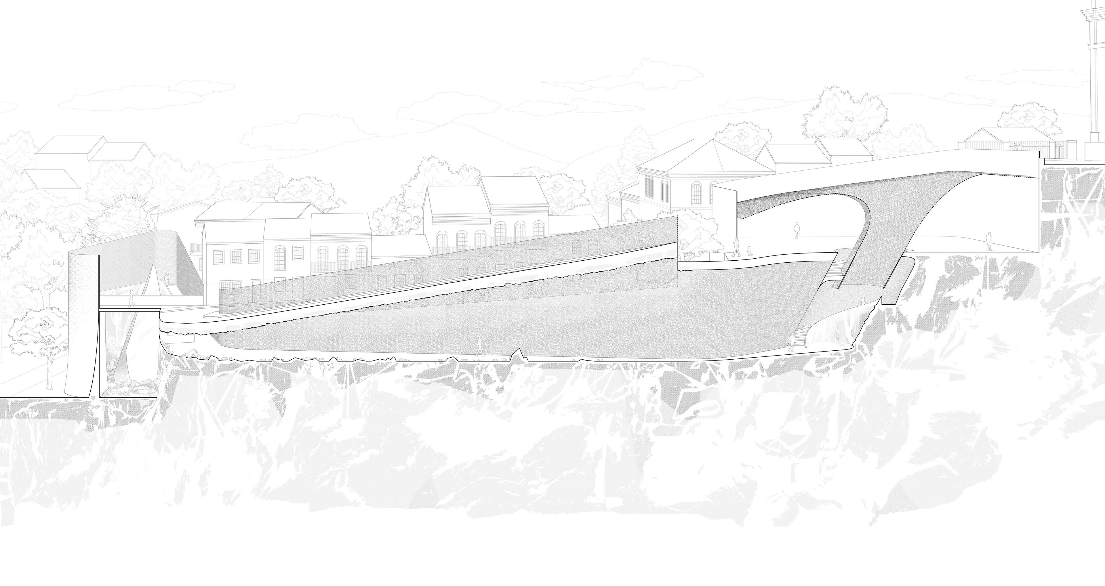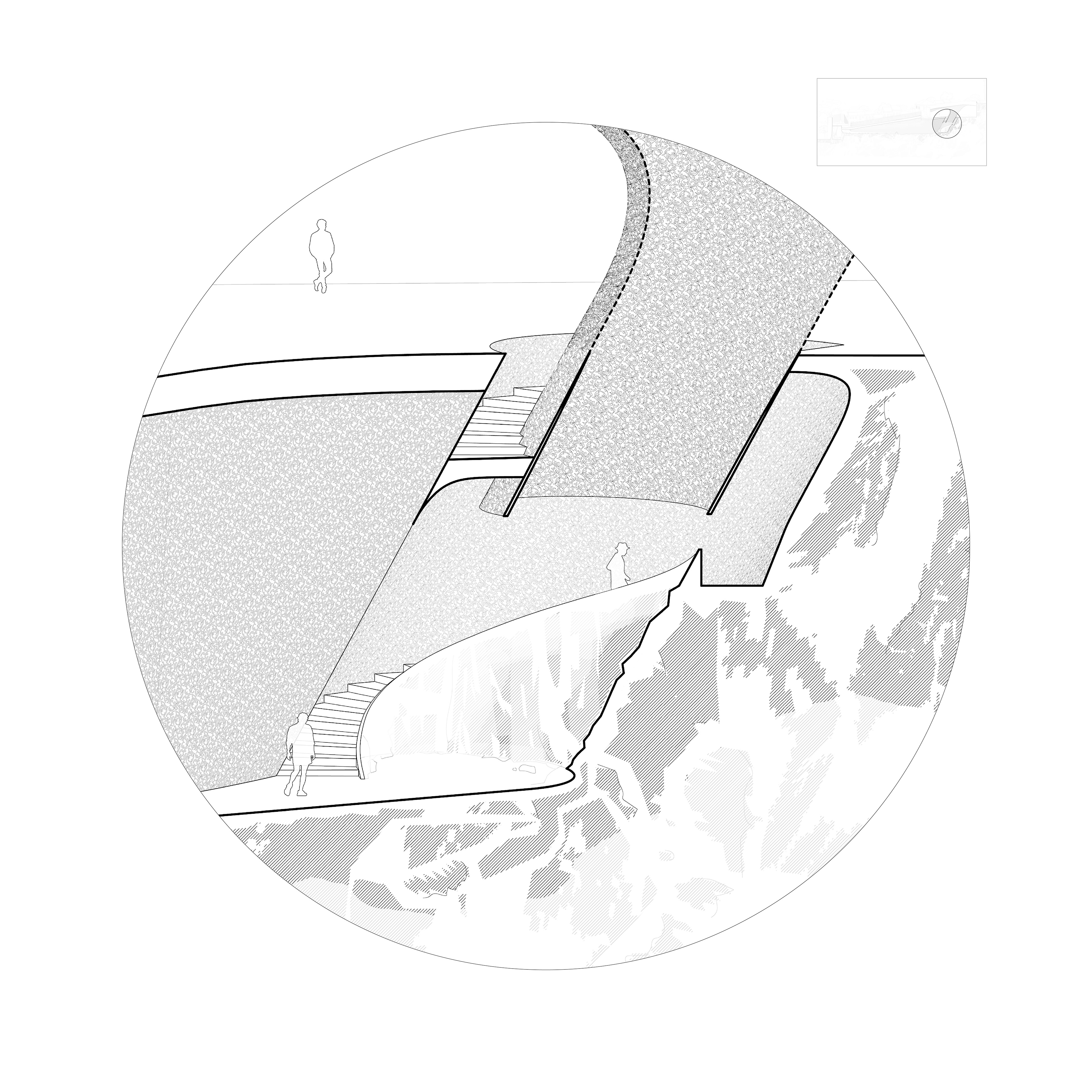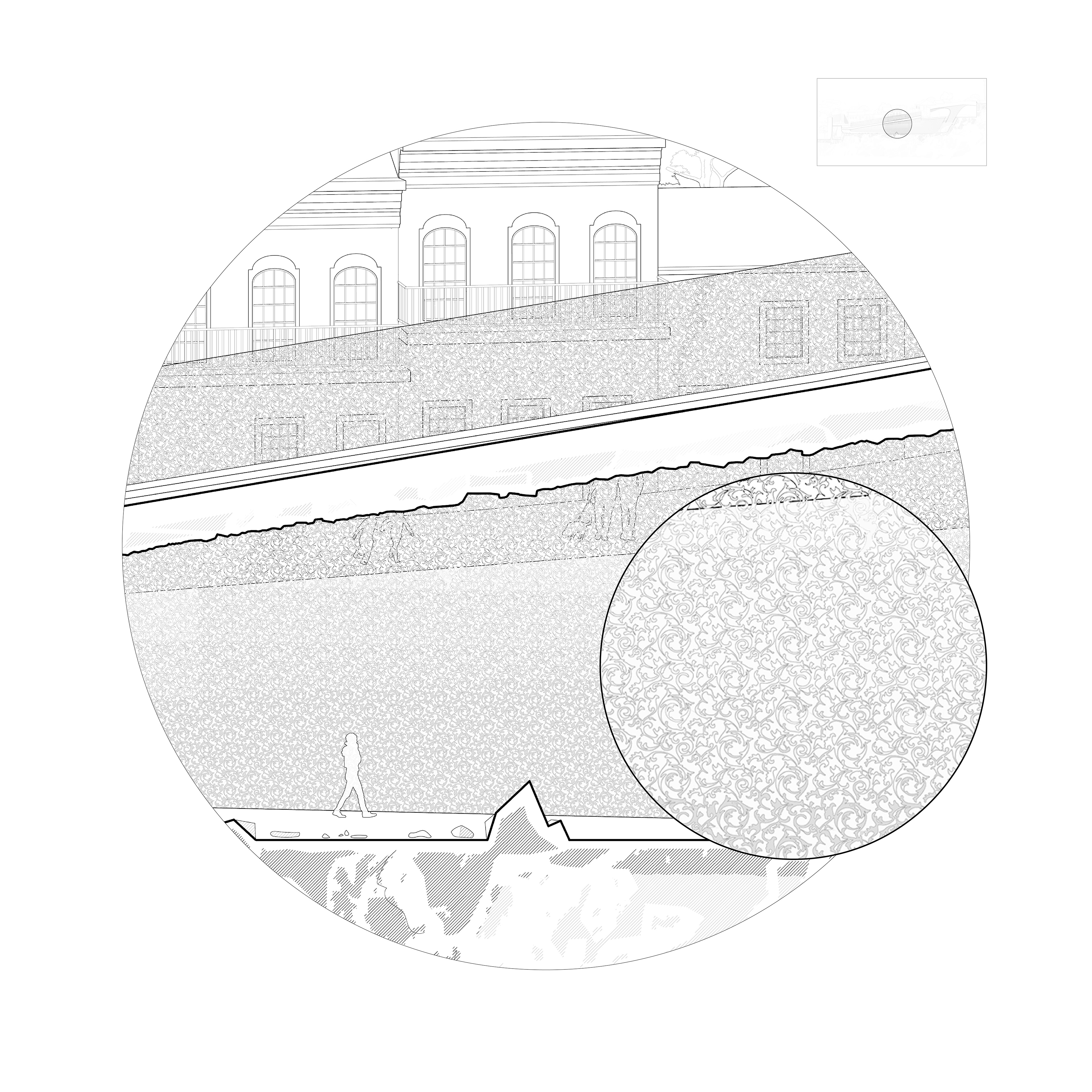 At this point, the Baroque patterns are then carved from the rock, and the ceramic becomes an inlay, becoming less and less as the path becomes darker and darker, until you are completely underground. The Oscar Niemeyer-inspired museum entrance "ramp" is actually a 1:20 sloped floor, bringing you a storey underground without you realizing.