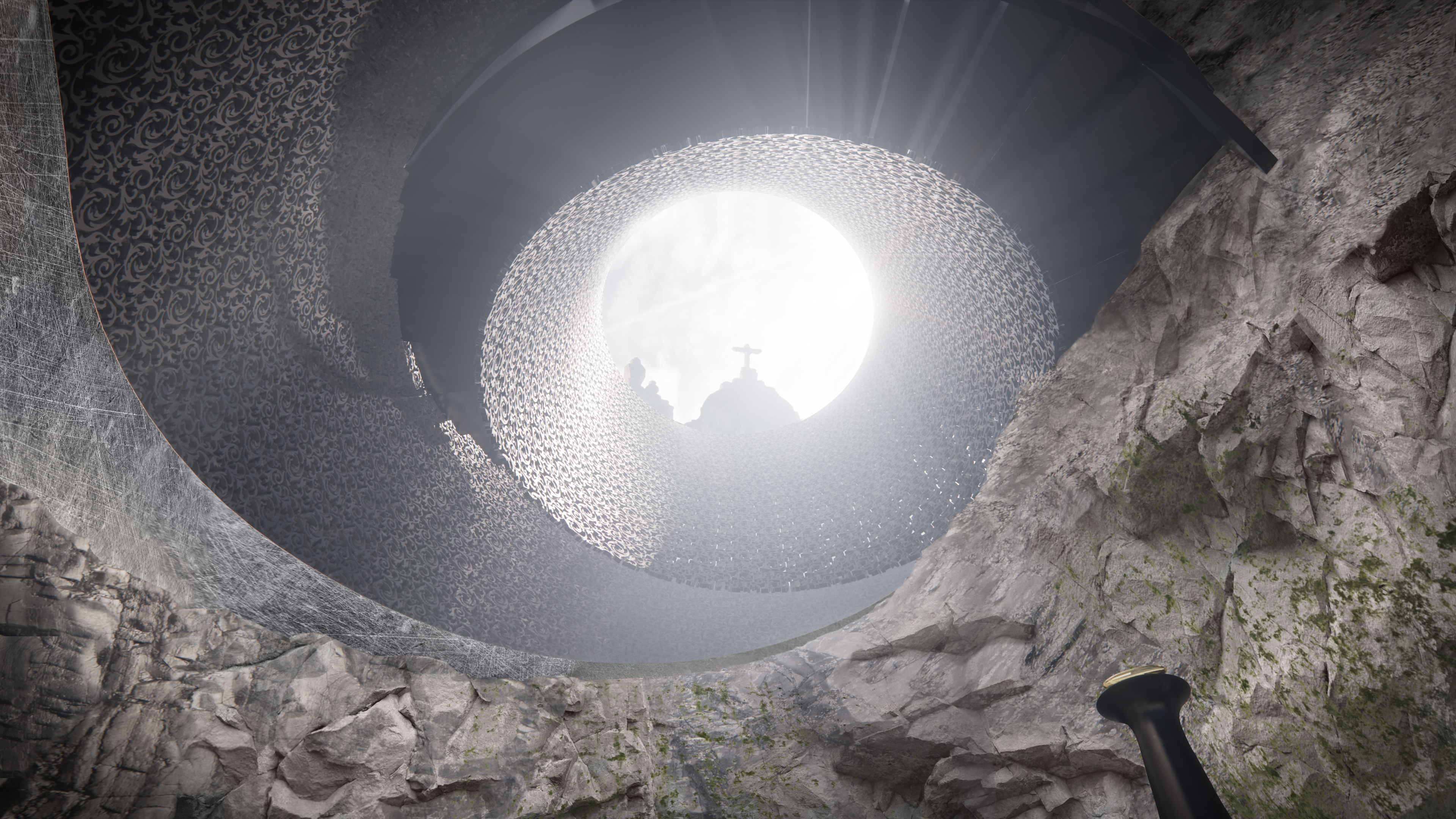 As you move forward, the walls narrow, and the ceiling rises, and the light fades away as the ceramic scrim forming the wall of the outdoor plaza above gets further and further away, transitioning to stone lower down the wall, until finally you are in complete darkness, with mere inches between you and the walls on either side, your next guide being the natural light reflecting off the rock coming from the shaft ahead.
