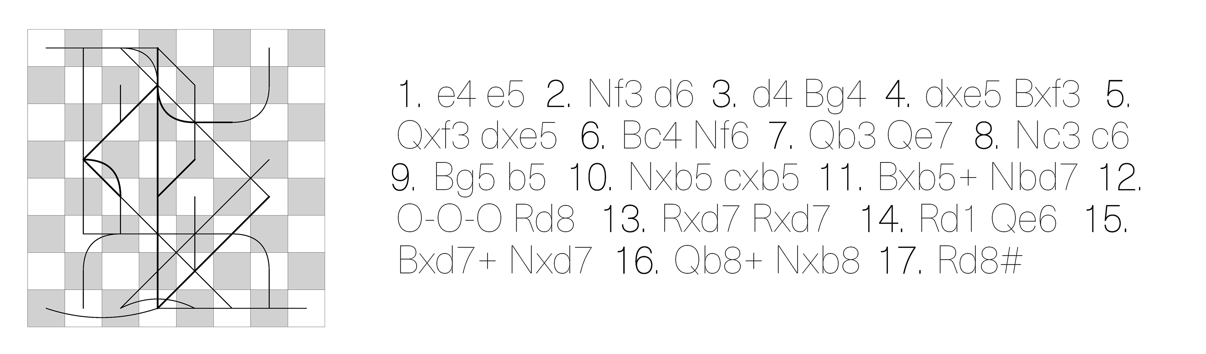 The chess game, "The Opera Game," is one of the most famous chess games, played by an American named Paul Morphy against a German noble at an opera in 1858. I charted regular moves, checks and captures, then pulled out elements I could see planimetric potential in, and moved on from there. The game, in chess notation, is on the right.
