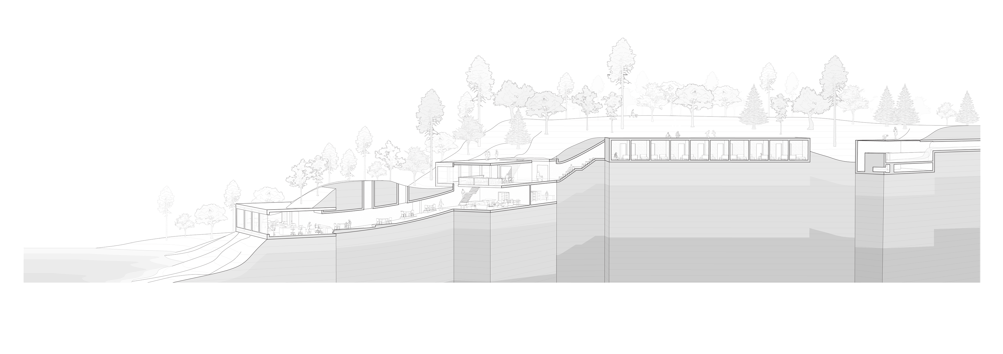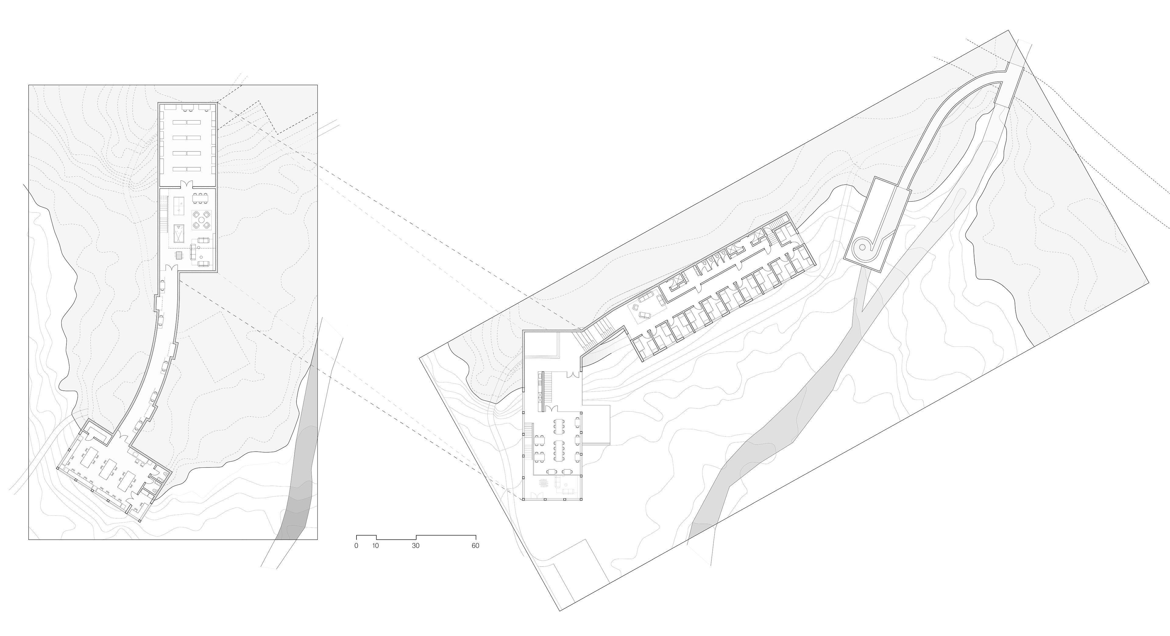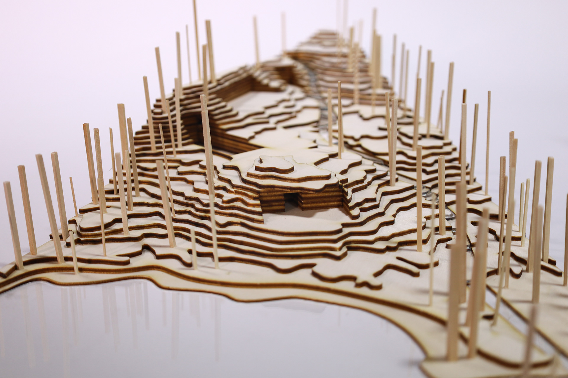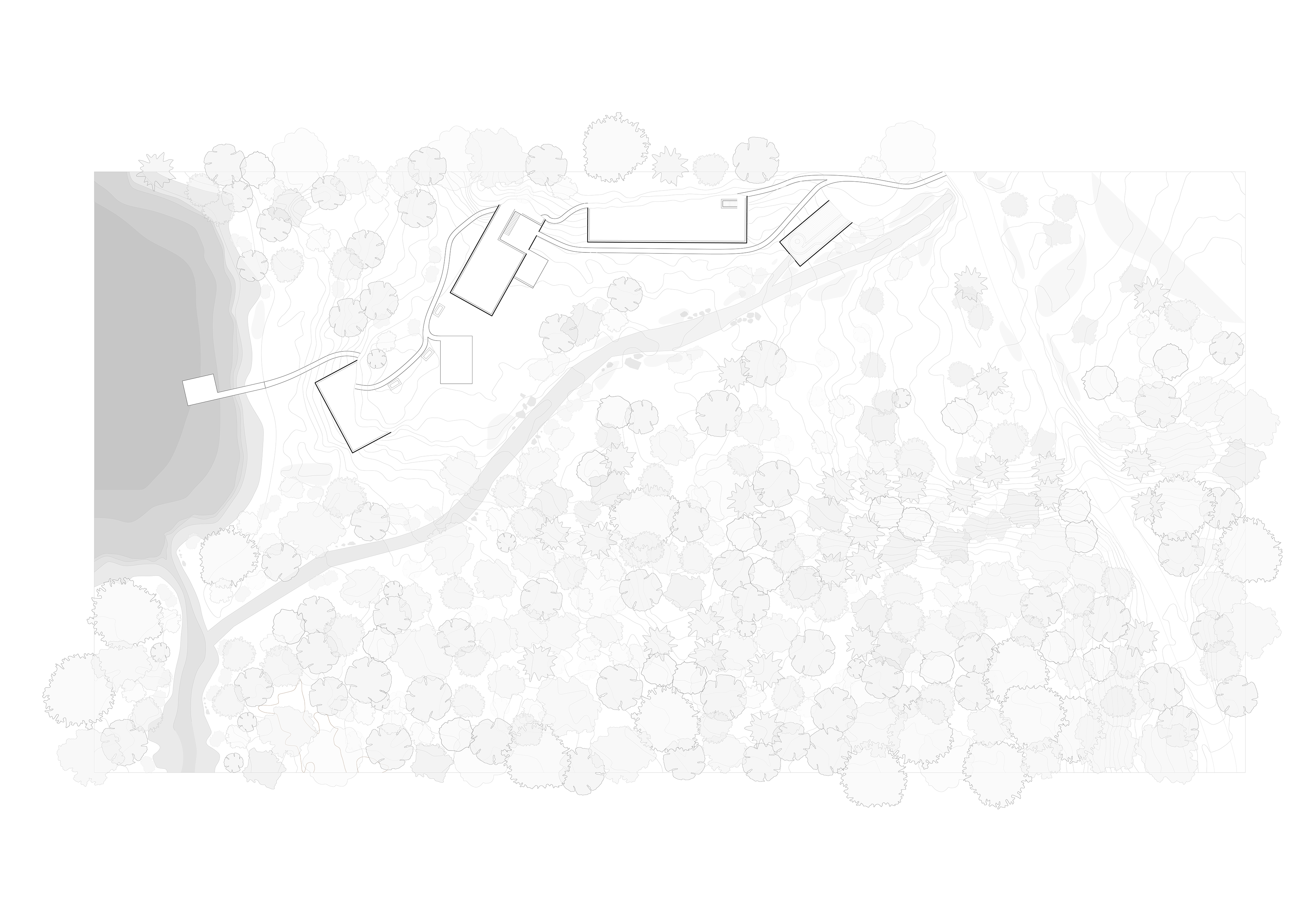 My proposal for a forest research facility in the Yale Myers Forest moves much like a root, moving downward with gravity, meandering like the river, until it reaches the body of water at the base of the hill, offering a previously inaccessible view of a substantial body of water just a few hundred feet from the Yale Forest Camp.