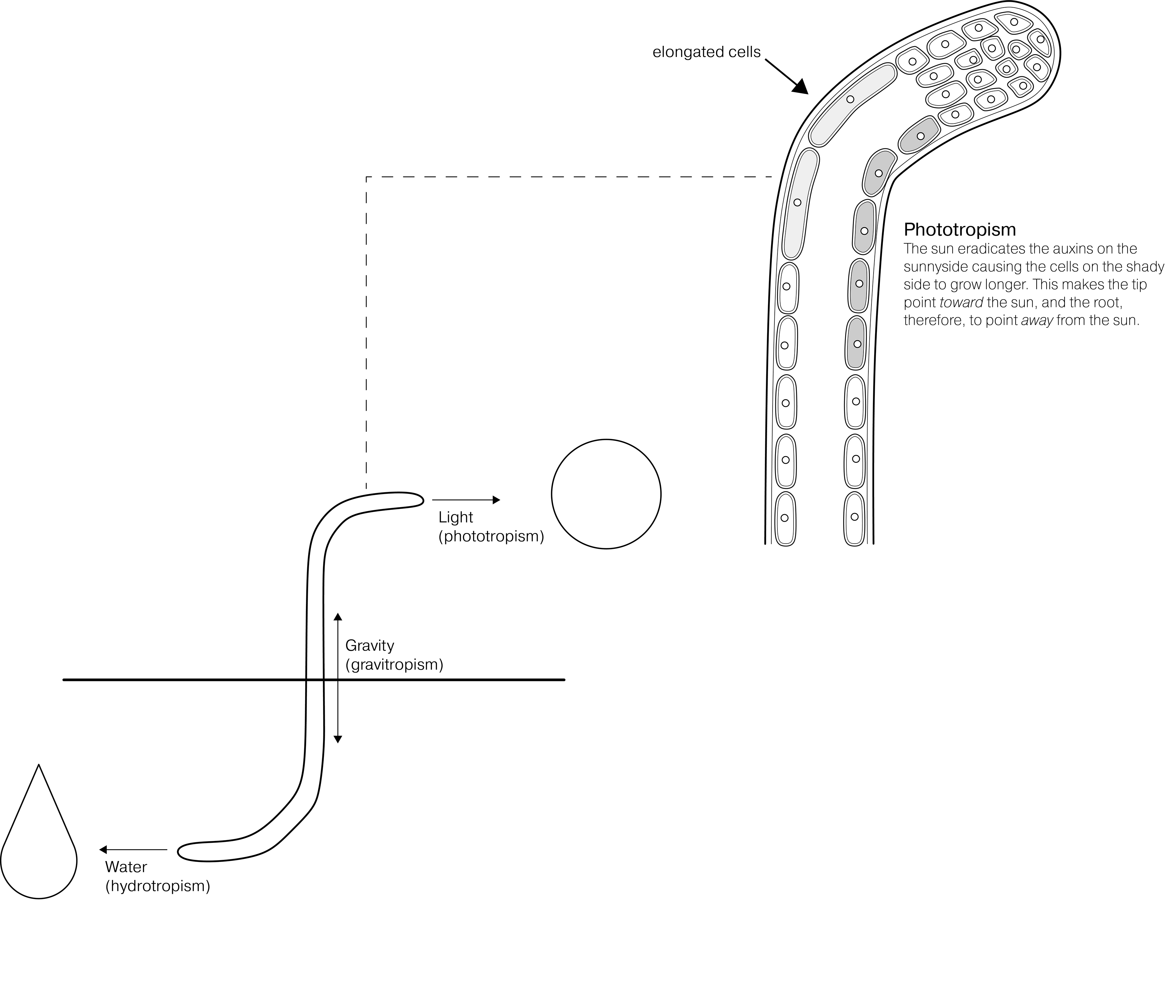 The central concept upon which my project is founded is Tropism--which is a phenomenon in biology in which a biological organism, usually a plant, grows or turns in response to an environmental stimulus. Both the branches and roots of a tree experience tropism in opposite ways: branches grow up, in the opposite direction of gravity, and then turn in the direction of a light source, while roots grow downward, with gravity, and away from light. One additional tropic characteristic of roots is that in the same way that branches will turn toward light, roots tend to navigate toward bodies of water.